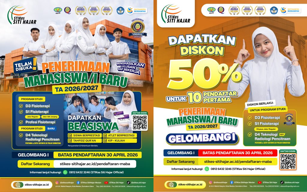 STIKes Siti Hajar adalah salah satu perguruan tinggi terbaik yang ada di sumatera utara. Sekolah Tinggi Ilmu kesehatan Siti Hajar Medan hadir dengan 4 Program Studi Unggulan Fisioterapi jenjang Diploma 3, Sarjana, Fisioterapis, Profesi Fisioterapis, dan Program Studi Teknologi Radiologi Pencitraan jenjang Diploma 4 yang telah TERAKREDITASI BAN-PT dan LAMPTKes (UNGGUL)